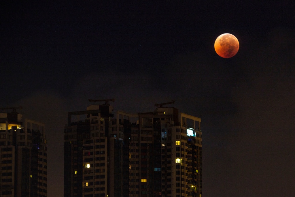 eclipse of the moon 地球运行到月亮和太阳的中间时, 太阳的光正好被地球挡住, 不能射到月亮上去, 因此月亮上就出现黑影, 这种现象叫月食。